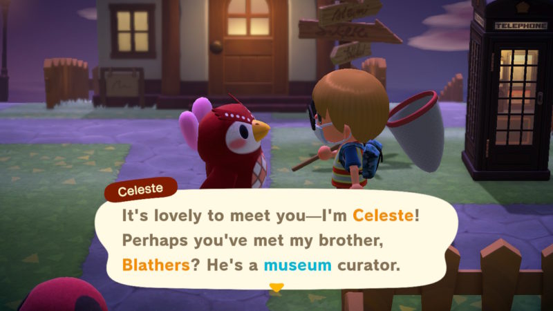 Celeste is an owl in the Animal Crossing series and is Blathers' younger sister. In previous games, she helped players identify and enjoy constellations, but her role in Animal Crossing: New Horizons has changed to informing players about shooting stars and meteor showers, as well as teaching them learn new DIY recipes for Wands and other items that incorporate Star Fragments and other materials gained from wishing on shooting stars..